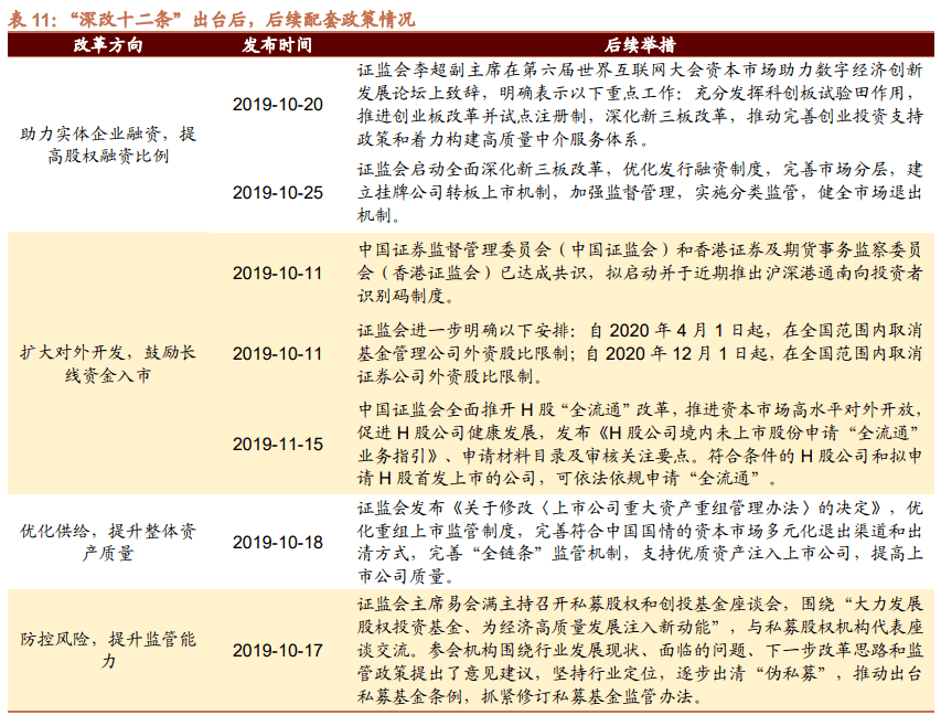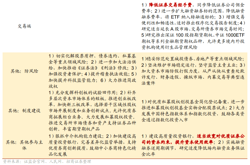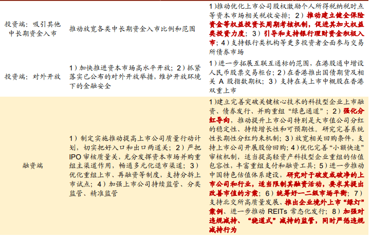 考虑到发布主体的区别(“新老国九条”由国务院出台,更多侧重于方向上的指引,而非细化实施细则),我们重点将本次证监会的表态对比了2019年由证监会出台的“深改十二条”,并根据投资端、融资端、交易端以及其他领域对政策重新梳理。