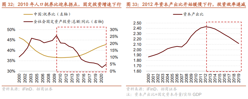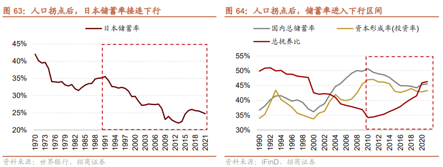 前文提到,人口拐点后,储蓄率带动投资率不可避免的进入长期下行区间,经济增长需靠消费拉动。从生命周期消费理论来看,人口结构会影响社会的总消费与总储蓄情况,当社会中中年人比例较大时,消费倾向较低,储蓄率上升。由于储蓄可转为投资需求,所以人口红利阶段,消费需求较弱,投资需求较强。同时,由于劳动年龄人口占总人口的比重持续上升,储蓄转化为投资,而投资又增加了经济的供给能力。因此,人口红利阶段,储蓄率的上升也会促进经济的潜在增长率;但当人口红利期过去,投资率开始下行,经济增长率也相应出现下降。观察日本经济发现,日本在1960年代越过刘易斯拐点后,经济增速出现了系统性的下滑。1990年前后,日本抚养比上升,储蓄率出现了接连20年的系统性下滑,经济增长中枢再一次下移。从中国来看,人口抚养比出现拐点后,我国储蓄率带动投资率开始处于长期下行区间,经济增长中枢下移,消费拉动经济增长的基础性作用有待提升。