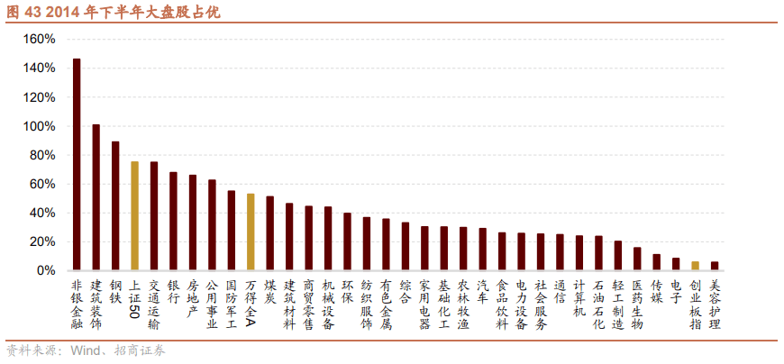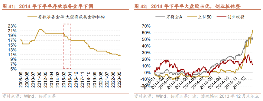 从2014年7月开始,大盘股的表现开始占优,主受流动性宽松以及开放预期的刺激。具体来看,进入2014年下半年,流动性开始改善,存款准备金率多次下调。此外,政府也在积极寻找海外的经济动能。2013年10月,中国首次倡议筹建亚洲基础设施投资银行;2014年7月,金砖国家开发银行宣布成立,总部设立在上海;11月,“一带一路”倡议提出,400亿美元的丝路基金也宣布设立。在流动性宽松和开放预期的刺激下,很多中字头的票突然底部放量、连续涨停,上证50半年涨幅59%,同期创业板指涨幅仅6%,大盘股表现占优。