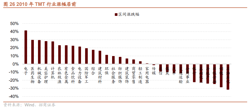 分行业来看,2010年TMT行业涨幅居前。创业板开通后,随着移动互联网的浪潮逐渐袭来,叠加政府在宏观以及资本市场的支持力度加大,2010年全年,电子、计算机等反映了科技浪潮的行业涨幅居前,分别上涨41%、27%。