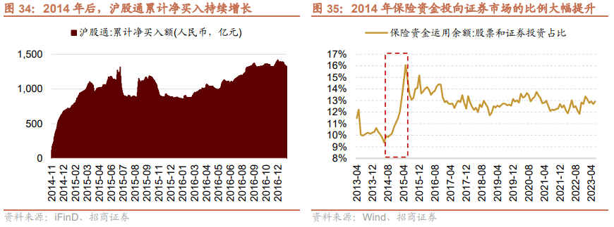 北向资金、保险资金等增量资金加速流入。“新国九条”提到要“壮大专业机构投资者”、“扩大资本市场开放”。作为配套落地政策之一,当年四季度沪港通股票开始交易,海外增量资金开始入市,从数据上来看,沪股通开通后仅3个月,累计净买入资金就近1000亿人民币,也正是在这一年,保监会发布《中国保监会关于保险资金投资创业板上市公司股票等有关问题的通知》,放行保险资金投资创业板股票,保险资金权益投资范围进一步扩大,投资于证券市场的保险资金占保险资金运用余额的比例一路攀升,从当年6月的9.37%,一度攀升至2015年5月的16.06%,成为历史高点。增量资金的加速流入为2015年的大牛市奠基了坚实的基础。