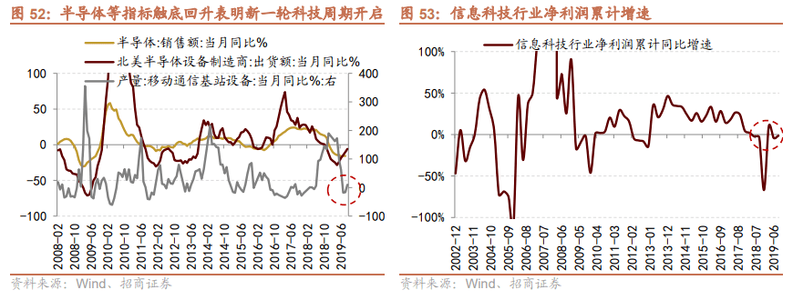 但值得注意的是,从半导体和基站等指标刻画的科技周期来看,2019年新一轮的科技周期正徐徐拉开序幕。2019年,在新一代通信技术的带动下,国内移动通信基站产量率先出现改善,海外半导体设备出货量、全球半导体销量已经出现触底回升。