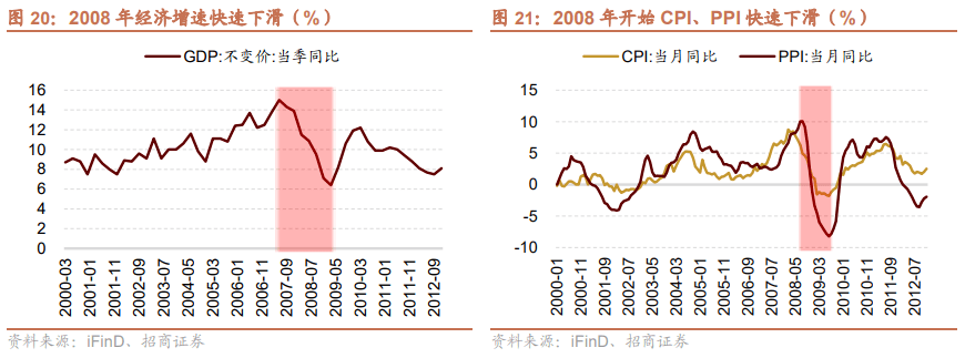 2008年全球金融危机席卷而来,外部承压下,中国经济增速快速下滑,CPI、PPI更是一度为负。具体来看,2008年开始,GDP增速一路下挫,从2008年一季度的11.5%,一路降至2009年一季度的6.4%。CPI、PPI数据接连下滑,CPI连续9个月为负值,PPI连续12个月为负值,最低CPI、PPI分别达到了2009年7月的-1.81%以及-8.22%。