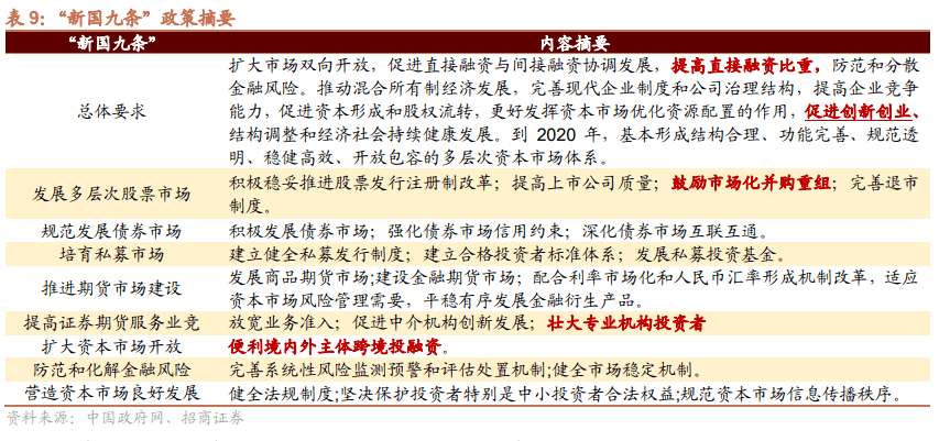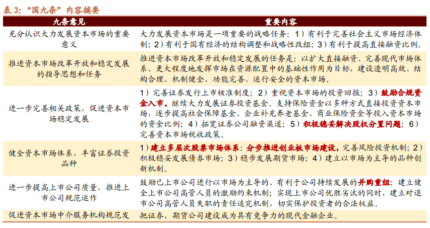 结合后续政策出台情况,根据我们分析,除了强调扩大直接融资外,国九条还重点强调了1)鼓励合规资金入市:继续大力发展证券投资基金。支持保险资金以多种方式直接投资资本市场,逐步提高社会保障基金、企业补充养老基金、商业保险资金等投入资本市场的资金比例;2)积极稳妥解决股权分置问题;3)建立多层次股票市场体系:分步推进创业板市场建设,完善风险投资机制;4)鼓励已上市公司进行以市场为主导的、有利于公司持续发展的并购重组。