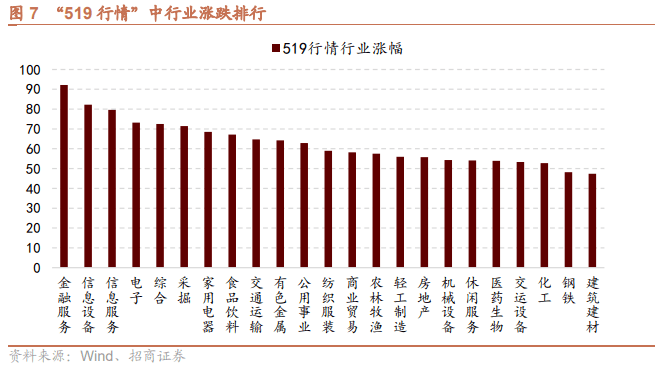 “519行情”应声而起:货币宽松加风险偏好提升,非银金融领涨。5月19日开盘后,市场一扫低迷态势。19日当天,上证指数的涨幅就达到了4.65%,有27只股票涨停。首日涨停的股票并未有明显行业分布和市值属性,市场对于上涨的方向上未有太多的共识。此后,市场找准了主攻方向,金融服务表现占优。其中,陕国投、爱建股份、鞍山信托(现为安信信托)、深发展A(现为平安银行)。