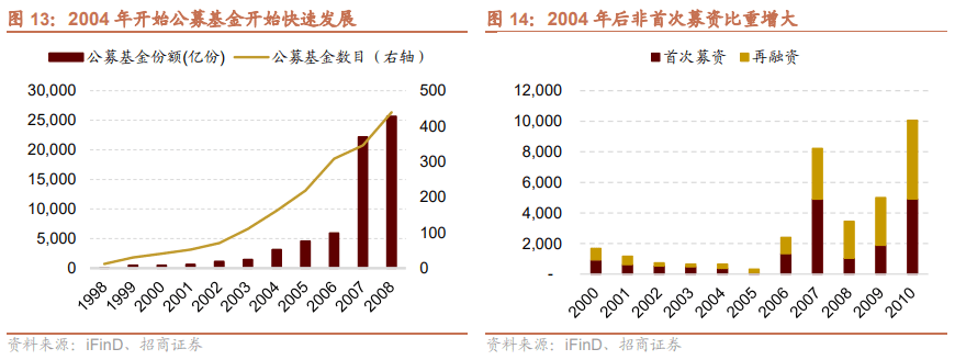 从政策的有效性来看,国九条实施后,直接融资比重开始逐步提高,公募基金快速发展,再融资占股票募集资金的比重快速攀升。具体来看,《基金法》正式实施后,公募基金迎来了快速发展的通道。2004年发行基金产品162只,募集份额为3137亿份,是前三年的募集份额的总和。《上市公司证券发行管理办法》发布后,再融资比例也大幅扩大。国九条的政策目标基本落实,为后续2007年开始的大牛市奠定了基础。