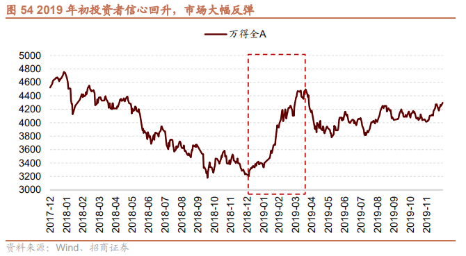 2018年底,面对信心不足,高层接连发声,着重肯定了民营经济与资本市场重要性。首先是10月31日的政治局会议。会议明确了经济发展压力的上行以及强调了资本市场改革。紧接着,在政治局会议结束的第二天,总书记主持召开民营企业座谈会,规格前所未有。会议肯定了民营经济的重要地位和作用,提出要坚持民营经济营造更好发展环境。此后,2019年初,投资者信心大幅回升,市场大幅回暖。2019年二月,投资者信心指数上升至67.1,较2018年末上涨21个点;2019年前三个月,万得全A累计回弹约31个百分点。