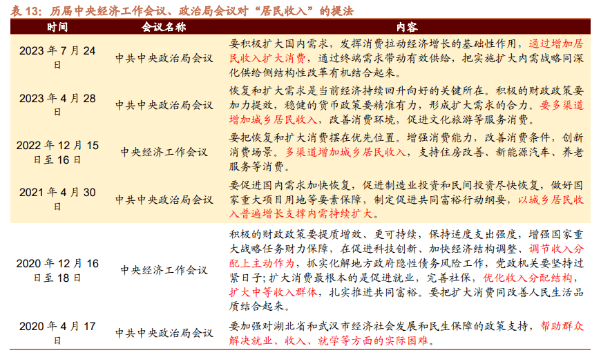 国内需求不足,需增加居民收入扩大消费。政治局会议指出,当前经济的主要挑战在于“国内需求不足”,因此要积极扩大国内需求,发挥消费拉动经济增长的基础性作用,就要“通过增加居民收入扩大消费,通过终端需求带动有效供给”。