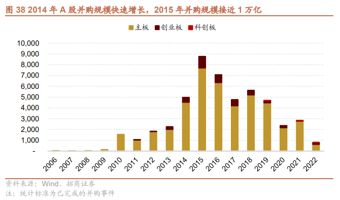 并购重组规模不断提升。“新国九条”提出,要“鼓励市场化并购重组”。2014年10月,证监会修订了《上市公司重大资产重组管理办法》、《上市公司收购管理办法》。这两个文件的重点之一便是提高并购重组审批效率,进一步放松了上市公司并购重组政策。在积极的政策催化下,2014年全年A股并购规模快速提高,较2013年大幅增加,2015年并购重组完成金额更是接近万亿,达到历史高点。并购重组规模的大幅增加一方面有利于产业整合、优化资源配置,另一方面也成为了2015年大牛市的有力推手。