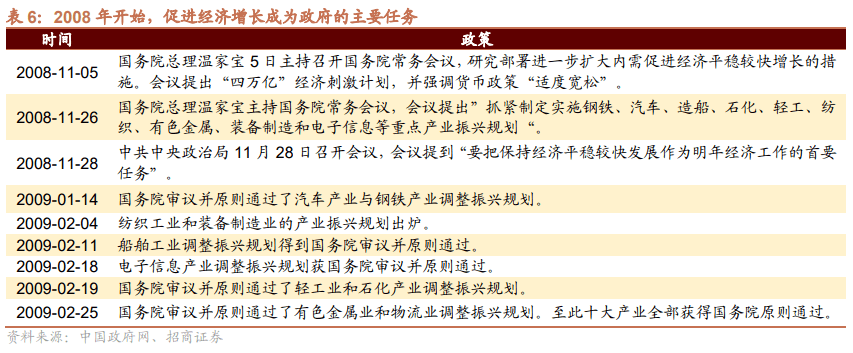 2008年开始,政府的首要任务变为了促进经济增长,整体政策环境宽松,流动性也较为充裕。在海外承压的背景下,2008年11月国常会提出“四万亿”经济刺激计划,并强调货币政策“适度宽松”。此后,政治局会议提到“要把保持经济平稳较快发展作为明年经济工作的首要任务”。