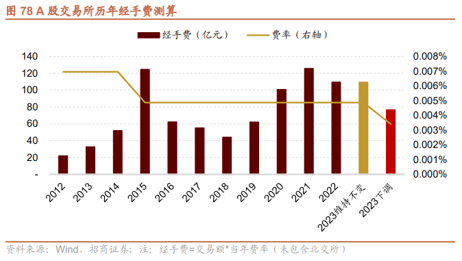 3)在交易端的政策数量显著增加,多管齐下降低投资者成本。具体来看,18日沪深交易所公告称,将A股、B股证券交易经手费从按成交金额的0.00487%双向收取下调为按成交金额的0.00341%双向收取,降幅达30%。这是近八年以来再次下调A股交易经手费。回顾过去,沪深交易所均在2012年、2015年下调A股交易经手费收费标准。2012年经手费降至0.00696%,当年降幅超过40%;2015年经手费降为0.00487%,降幅30%。根据我们测算,以2022年的交易额为基准,费率下调后,平均每年交易所将让利约40亿元。