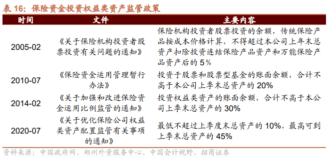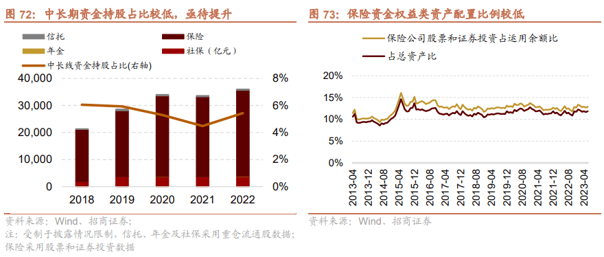 1)在投资端的举措明显增多,其中更是针对加大中长期资金引入力度作出了系统的安排,并针对大力发展权益类基金提出六项措施。具体来看,证监会指出,中长期资金不足仍是制约资本市场健康发展的突出问题。根据我们计算,将保险、年金、社保及信托等四类中长期资金持股市值加总发现,这四类中长期资金占A股流通市值的比例较低,远低于境外成熟市场普遍超过20%的水平。以保险公司为例,当前保险公司投资股票和证券的资金占总资产比以及占资金运用余额的比例还不到15%;而根据相关规定,险企权益类资产投资比例最高可达到上季末总资产的45%。