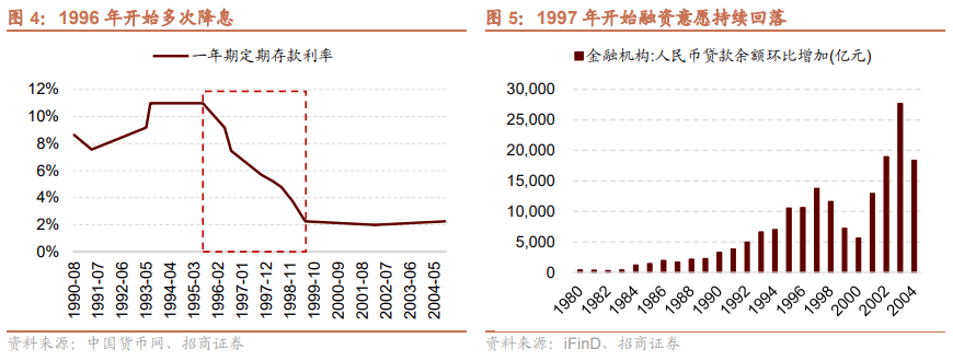在内外交困的背景下,政府实施了宽松的货币政策,自1996年开始持续多次降息,鼓励居民消费,但企业投资意愿仍较为低迷,导致信贷增速持续回落。