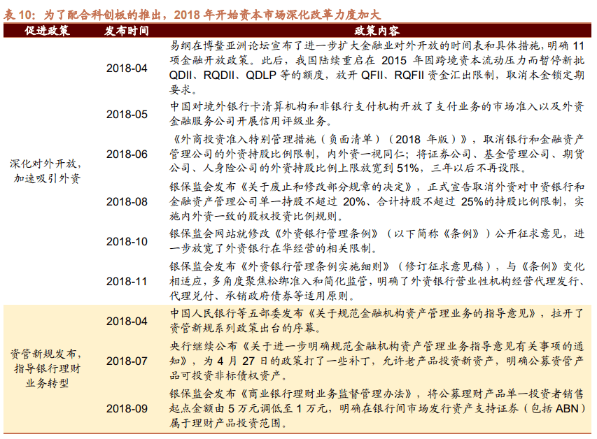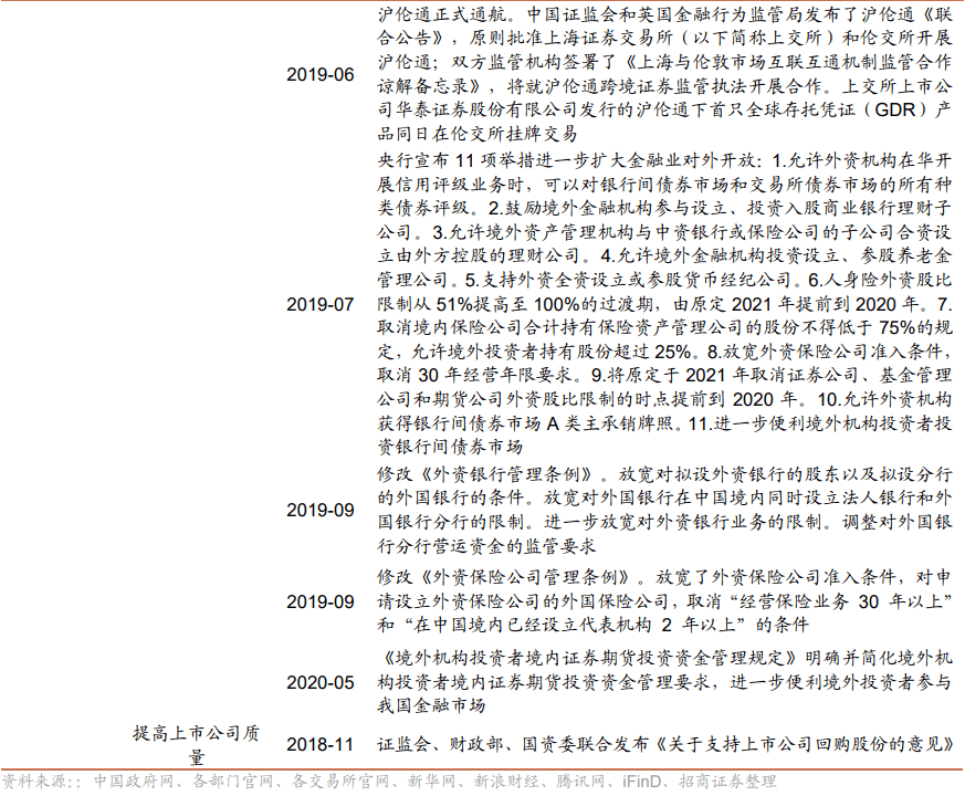 资本市场来看,为了配合2019年科创板开板,2018年开始资本市场深化改革力度加大。2018年底的中央经济工作会议提到“资本市场在金融运行中具有牵一发而动全身的作用”,资本市场的重要地位再一次被强调。此后,政府对资本市场深化改革的表述和力度持续加强。2019年下半年,融资、交易规则加大优化幅度,降准释放流动性,对外开放进程提速。