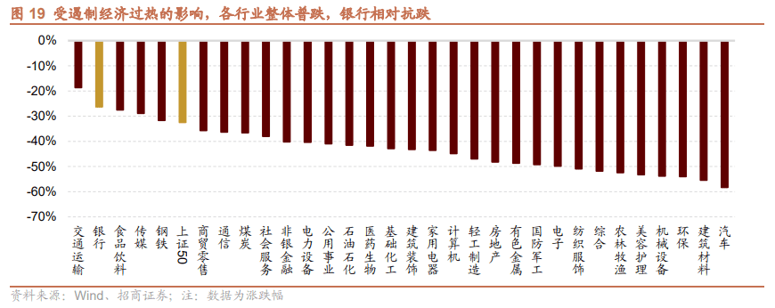 在遏制经济过热,A股一年多的下跌时间里,各行业跌幅都较深,相对抗跌的则是开启股份制改革的银行板块。
