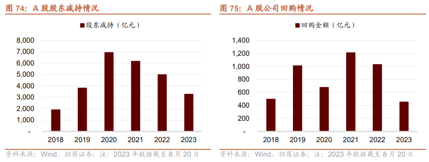 2)在融资端的举措上, 本次提出优化分红、回购等制度,增加投资者获得感,并特别强调了加强对违规减持的监管,限制破净增发,保护投资者权益;统筹一二级市场平衡,根据二级市场承受能力调节发行节奏。具体来看,增加投资者获得感方面,近年来,证监会多方面鼓励、支持上市公司开展股份回购,A股市场回购规模整体稳步增长。虽然2023年截至8月的回购金额相对较小,但近期已有提速之势。据新浪财经报道,8月17日,近30家上市公司同日发布回购计划 。保护投资者权益方面,本次一揽子措施中,特别强调了要进一步监管违规减持行为。近年来,随着监管口径的持续明确,对可能存在的制度漏洞的持续消除,减持金额呈持续下滑态势。此外,本次采访特别强调了对破净增发的限制,提到要“推动中国特色估值体系建设。突出扶优限劣,研究对于破发或破净的上市公司和行业,适当限制其融资活动,要求其提出改善市值的方案”。根据我们统计目前A股中,地方国企市净率低于1的公司较多,当前破净的公司主要集中于地产、银行、建筑、交运、钢铁等传统行业。此项规定有望激发低估值央国企的经营活力,进一步推动“中特估”健康发展。
