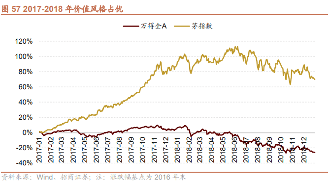 2017-2018年间,中国金融市场开放程度不断提高,A股市场国际化进程不断加速。2017年6月,MSCI指数公司宣布将A股大盘成分两步纳入MSCI;2018年6月A 股纳入MSCI正式实施;2018年9月A股纳入富时罗素指数的比例提高至5%。因此,在此期间,以茅指数为代表的价值股占优。