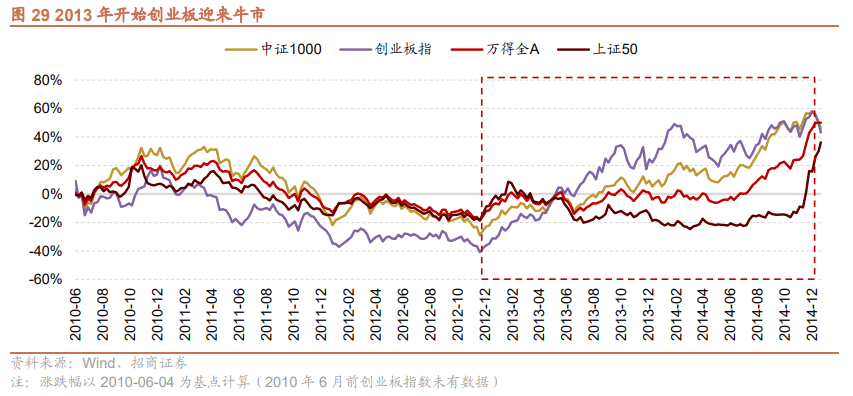 2009年《暂行办法》提出后,大力提振了资本市场的信心,A股整体进入了长达半年的上行区间。具体来看,2009年的3到12月,万得全A累计上涨46%;而代表成长性行业的小盘指数中证1000则累计上涨了58%。但2010年开始大盘指数呈下跌态势,累计下跌22%,拖累万得全A下跌6%,但与此同时创业板指累计上涨13%,表现优异。