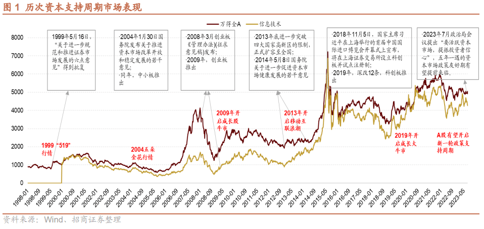 时间来到了2023年。当前,经济在疫后开启曲折式修复的进程,内需不足,A股投资者情绪趋于悲观,民营经济活力亟需提振。本次“活跃资本市场”的表述是2013年以来的政治局会议上的首次出现;而“提振投资者信心”中“投资者信心”这个表述上一次出现还是在2008年12月的中央经济会议。资本市场有望再度迎来政策支持发力周期,若政策成功吸引增量资金入市,将会使上行行情持续更久,改善风险偏好。