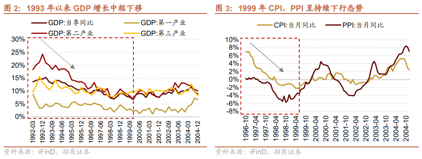 1999年,中国面临内外交困的态势,内有经济内生动力不足,外受亚洲金融危机影响。内部来看,1993年以来,中国经济整体较为低迷,GDP增速从1993年的15%,降低至1999年的6.7%;PPI自1997年6月至1999年12月连续31个月为负;CPI也呈持续下行态势。此外,1998年长江流域发生了百年不遇的洪涝灾害,进一步打击了中国经济的发展。外部来看,1997年亚洲金融危机爆发,且逐渐从区域性危机演变为全球性动荡,拉低世界贸易整体增长速度,导致初级产品价格持续走低。此外,“科索沃战争”爆发,极大程度的打击了欧洲的经济,欧元对美元比价跌至历史低位。