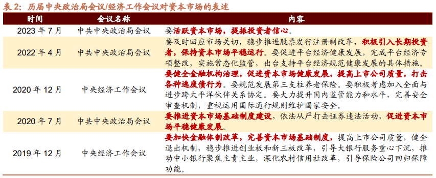 本次政治局会议定调,“活跃资本市场,提振投资者信心”,与以往政策周期对资本市场的诉求重点在融资端不同,本次会议在表述以及后续媒体跟进上可以看出,重点在于投资端。我们认为这可以和从2021年4月政治局会议开始提出的扩大居民收入相结合。在房地产供需新形势下,房地产的财富效应递减,对居民财产性收入的支撑有限。未来增加居民财产性收入可以通过股市来实现。但当前A股的持续赚钱效应不足,存在估值波动大、趋势交易显著等问题。若要使A股能够有持续的赚钱效应,就需要多举措活跃资本市场。18日,证监会相关负责人接受采访,公布一揽子活跃资本市场、提振投资者信心的措施。我们认为这传递了监管部门明确的决心和坚定的信心,后续各项细则有望逐步落地,资本市场迎来新一轮政策支持发力周期。