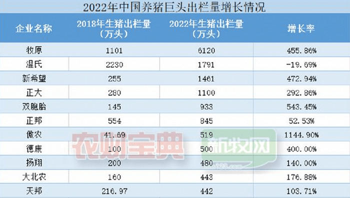 自2018年非洲猪瘟爆发以来,除了温氏集团因种种原因未能快马加鞭,各大养猪巨头纷纷实现弯道超车,养殖规模呈翻倍式增长。其中,新希望增长了4.7倍,却位居第三,之上的傲农、双胞胎分别增长了11.4倍和5.43倍,令人惊叹。