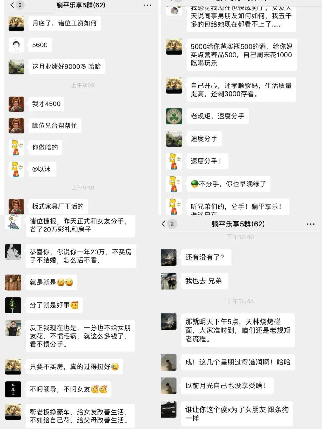 最近,一位网友卧底了一个“躺平乐享群”,发现里面的很多年轻男性都开始躺平了。甚至大肆宣称:“恋爱结婚令人痛苦,单身躺平享乐至上”!