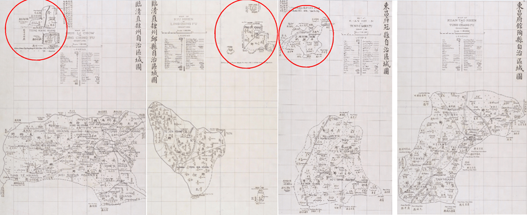 1911年《山东全省州县自治区域图》中的有关临清、冠县、邱县以及馆陶县图,可见只有馆陶县没有飞地